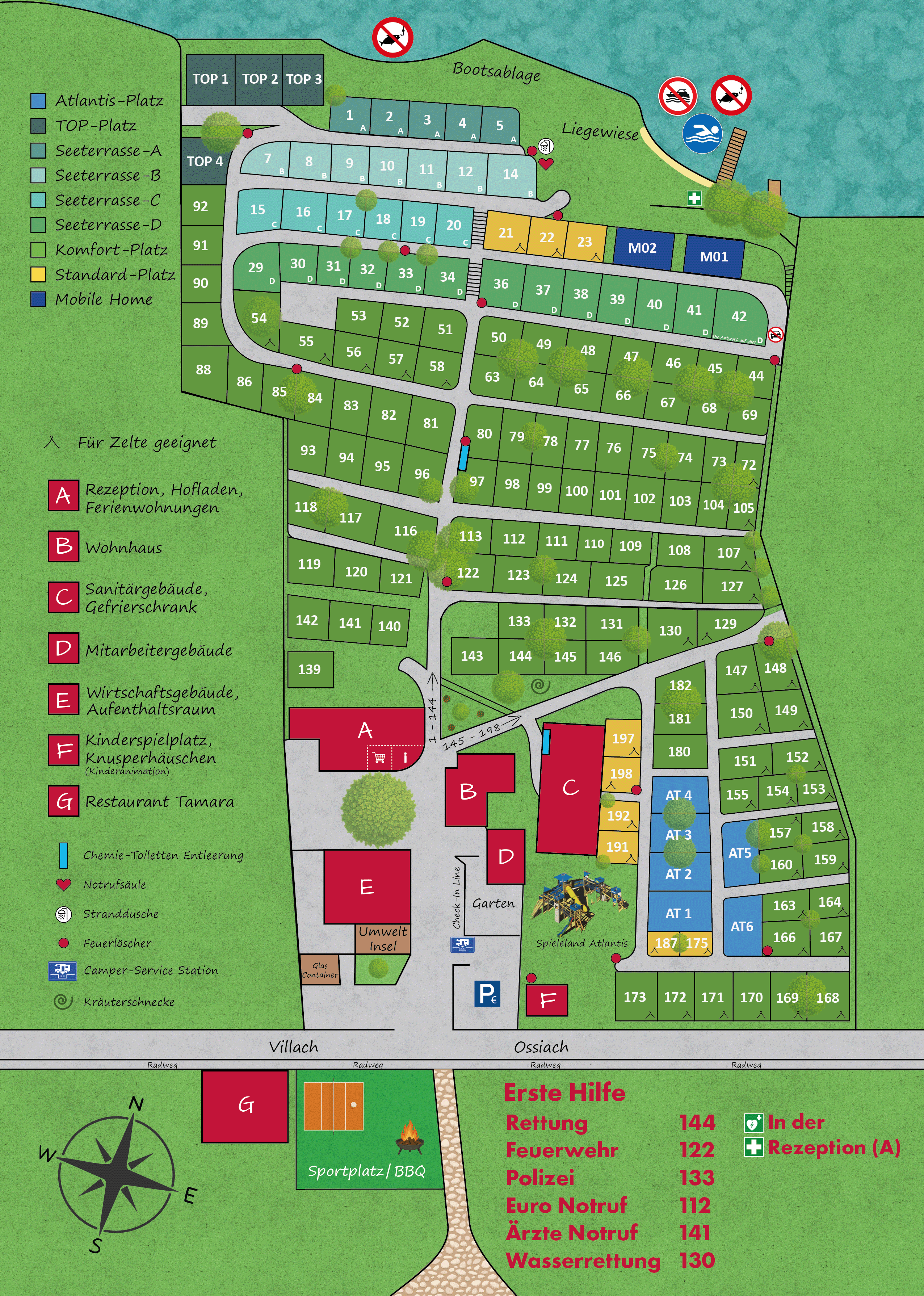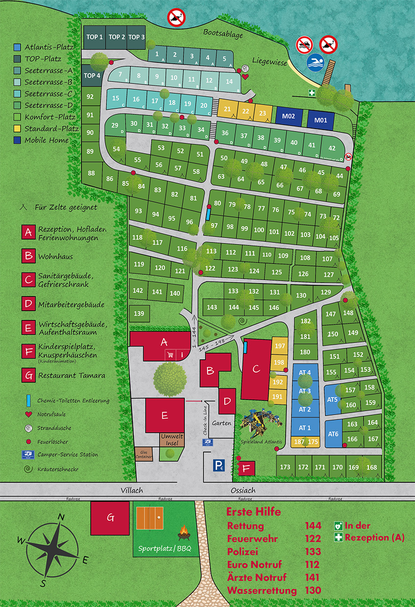 Unser parkähnlich angelegter Campingplatz in Kärnten liegt direkt am Ossiacher See und ist mit Hecken, Sträuchern und schattenspendenden Bäumen bepflanzt.